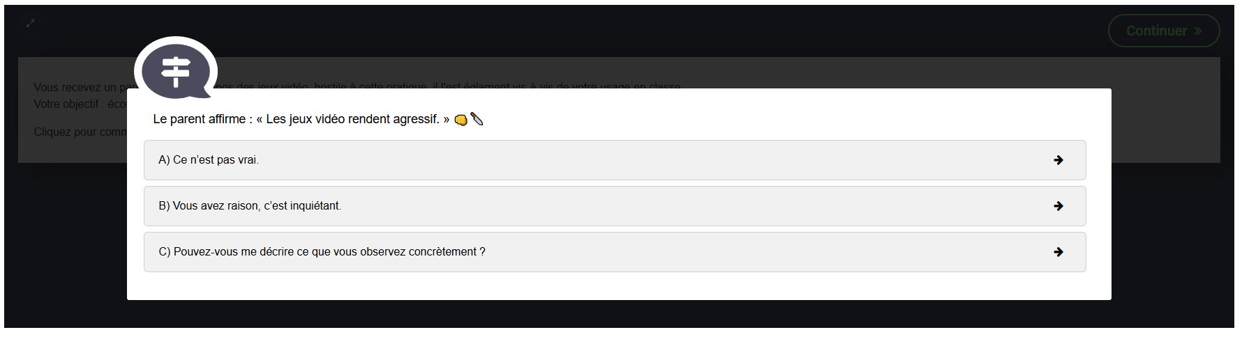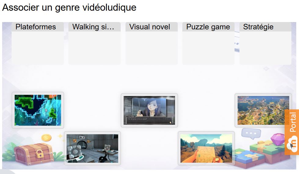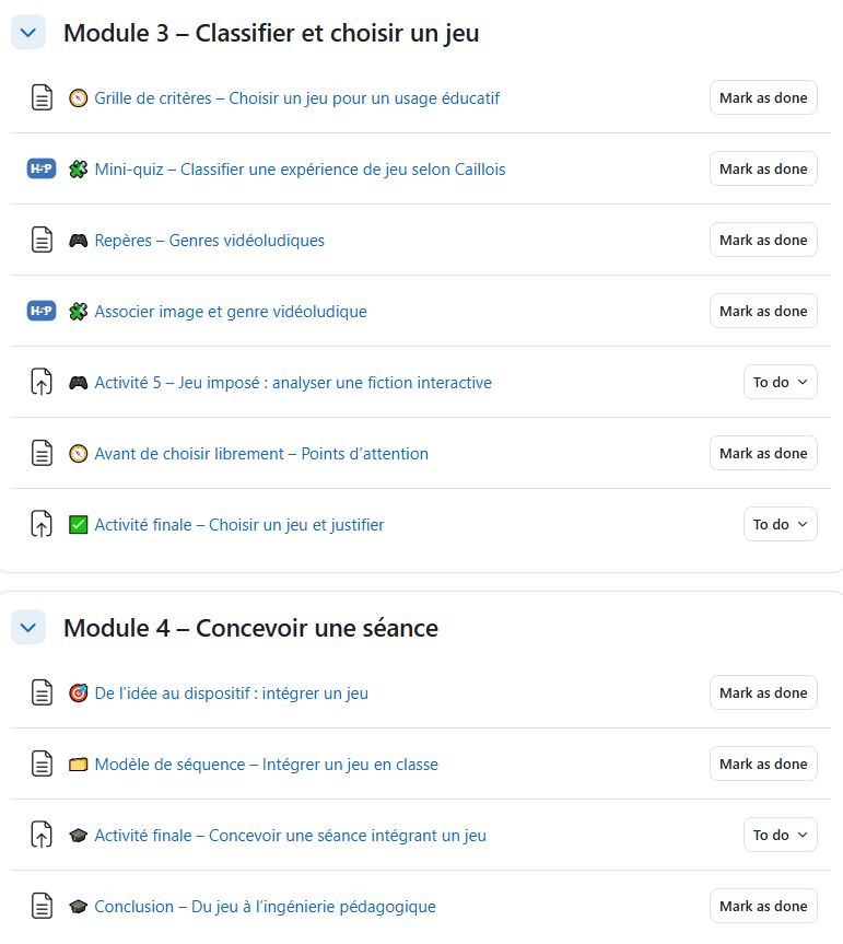 Ces captures illustrent lâarchitecture du parcours Moodle : pages de cadrage thĂ©orique, formulation explicite des objectifs et activitĂ©s interactives conçues avec H5P (jeu de rĂŽle dĂ©cisionnel, exercice de classification des genres vidĂ©oludiques en drag-and-drop).