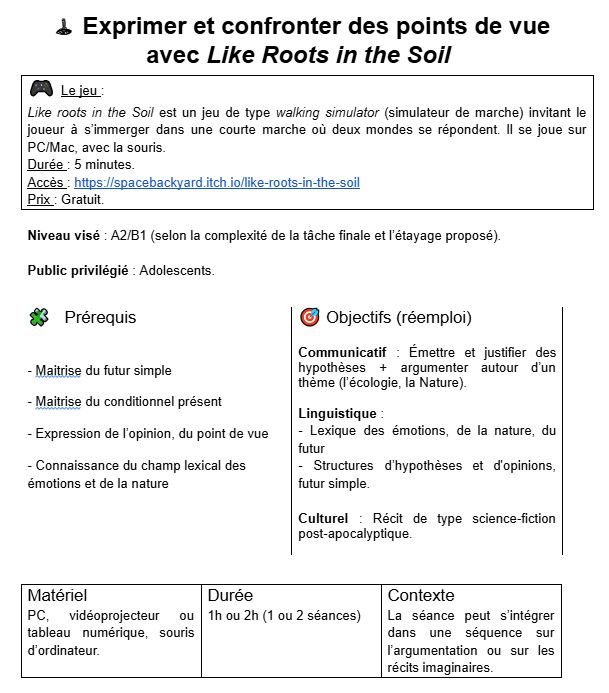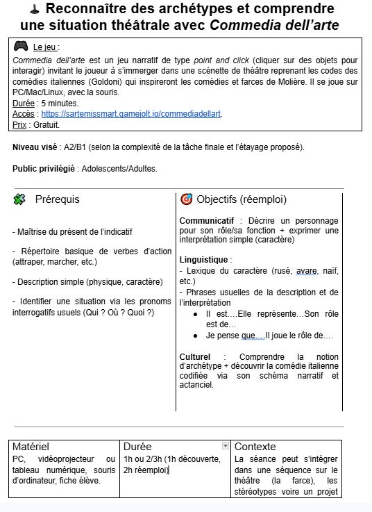 Les captures ci-dessous illustrent la structure type dâune fiche : analyse du jeu, objectifs, dĂ©roulĂ©, prolongements.